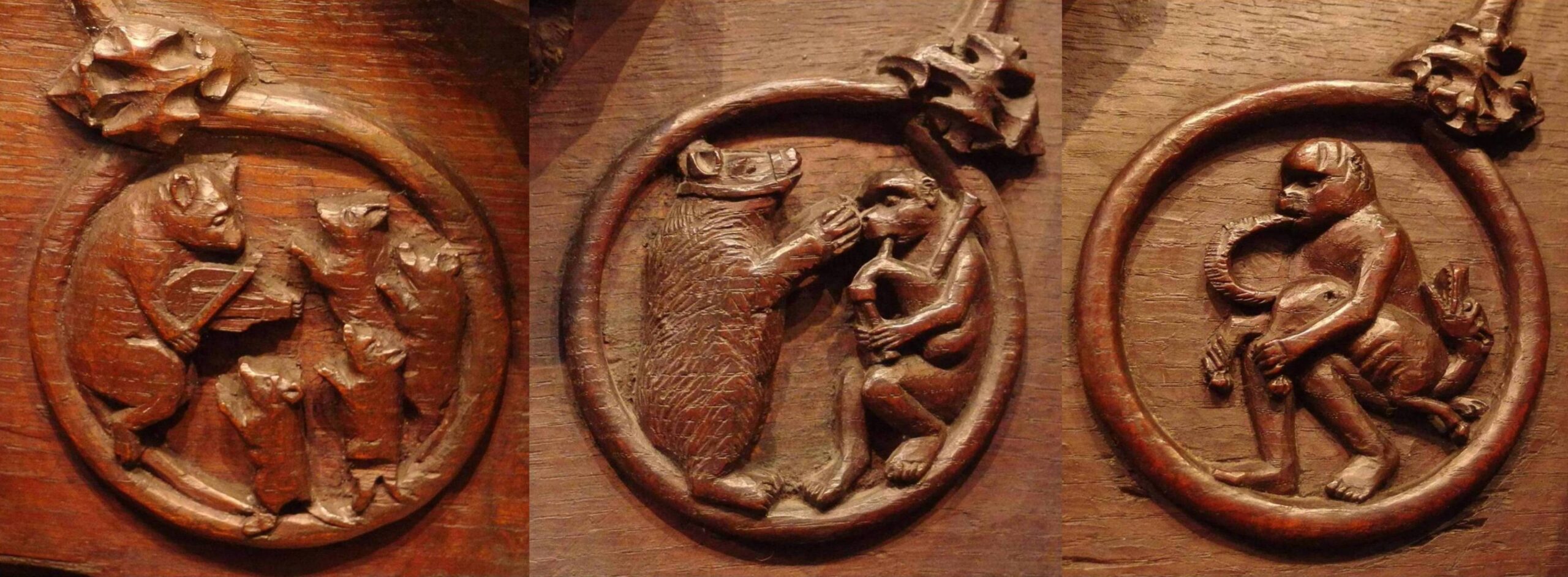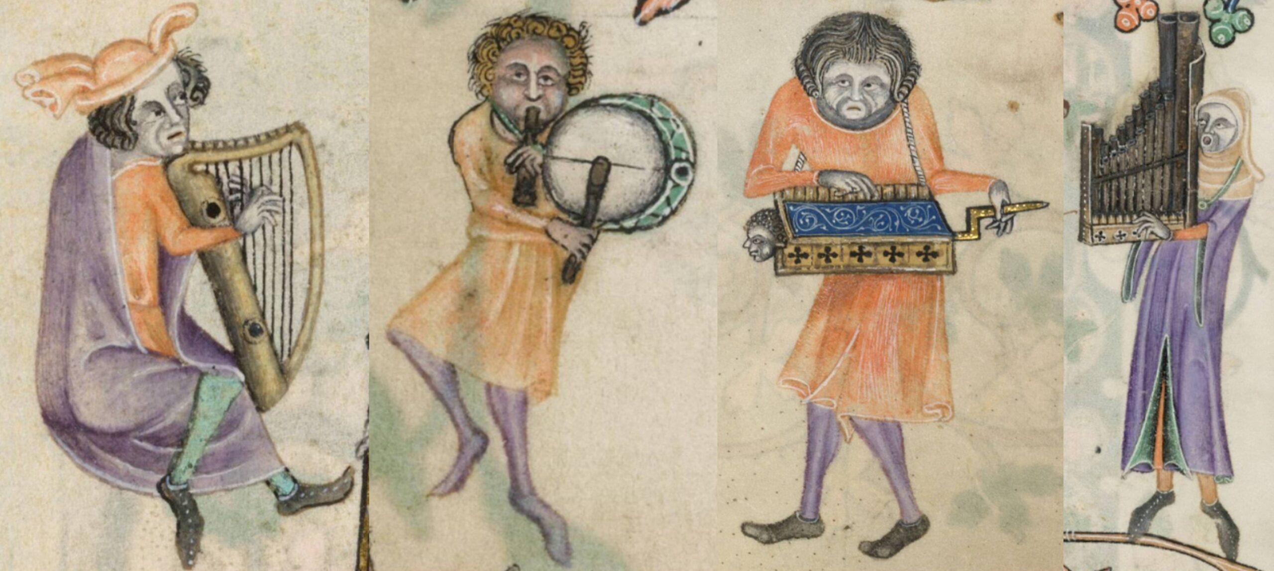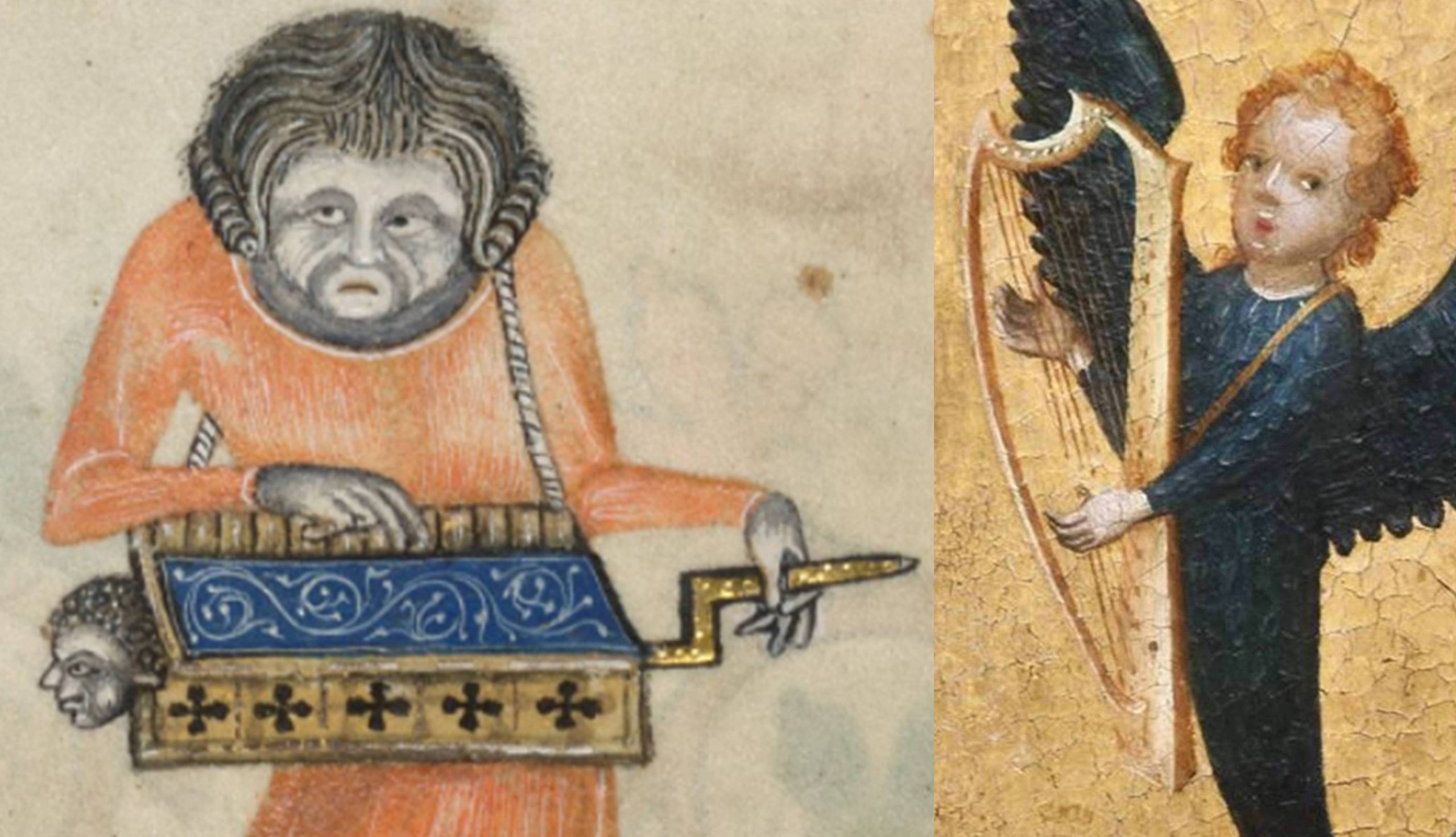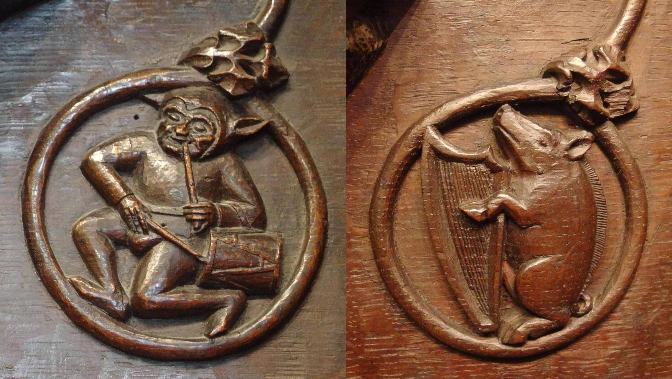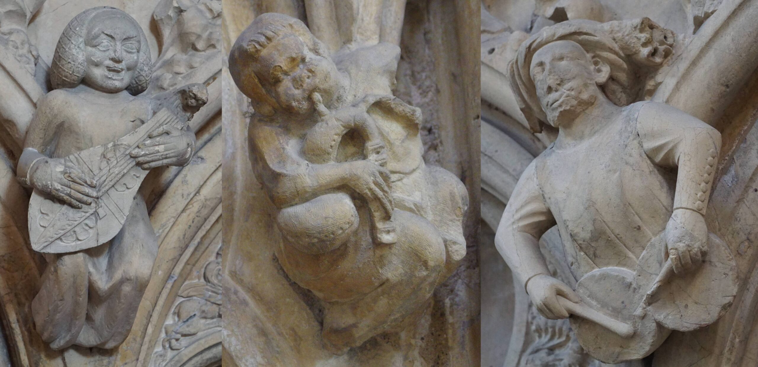 There is one location missing from the list above, so densely populated with instruments that it is described in a second dedicated article: the magnificent pulpitum or Kings Screen, 1473–1500, with 56 carvings of 20 different instruments, including shawms, bagpipes, trumpets, transverse flute, recorder, double recorder, lutes, bray harps, gitterns, rotas, fiddles, symphonie, tromba marina, portative organs, positive organ, clavicimbalum, cymbals, fool’s percussion, triangle, nakers, and singers. The second article is available here.