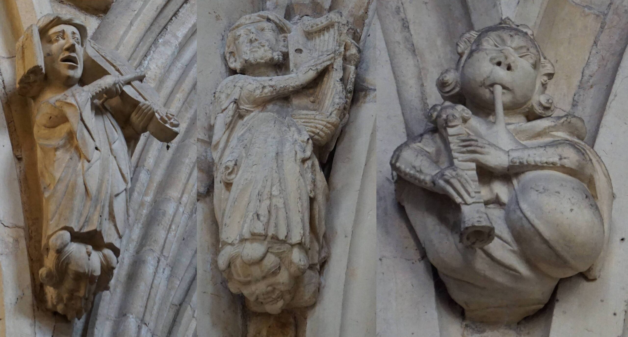The current building of York Minster was founded in c. 1225 and added to for many centuries, as is typical for a medieval church. During that period, depictions of medieval and renaissance musicians were carved in stone and crafted in stained glass. There is also an actual musical instrument on display, an oliphant from c. 1030 (pictured above).