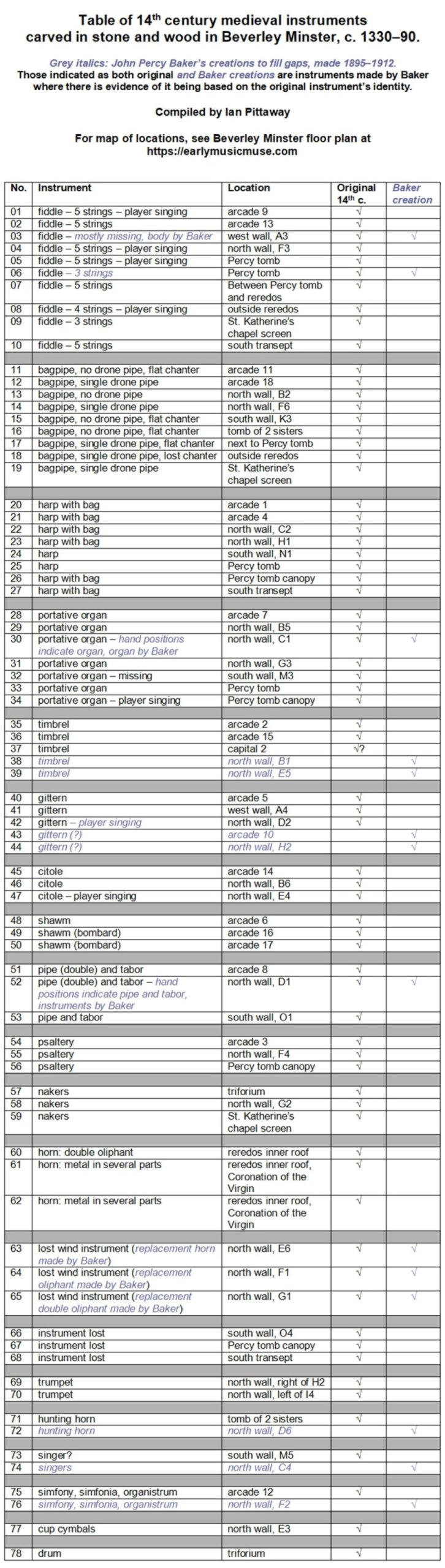 This survey shows that, since the work of John Percy Baker, who repaired the minstrels with great skill and care between 1895 and 1912 under the leadership of the Minster’s vicar, Canon Henry Nolloth, the magnificent medieval minstrels of Beverley Minster have suffered from being either completely ignored or repeatedly misidentified. This cumulative lack of information, detail or, for the most part, any mention at all, is my reason for going into the detail in these 8 articles that I have seen nowhere else. I have aimed for an accuracy of description not available either to the early music enthusiast or to authors with an interest in buildings who need readily accessible and correct information about medieval musical instruments. Only in latter years have the minstrels’ instruments, when referenced at all, been identified correctly, and even now far from consistently. Until this series of articles, they have never been analysed in detail. They have been and continue to be poorly served and wrongly described. There remains not a single print publication of all the medieval minstrels, nor are they collectively described on any website until this series of articles.
