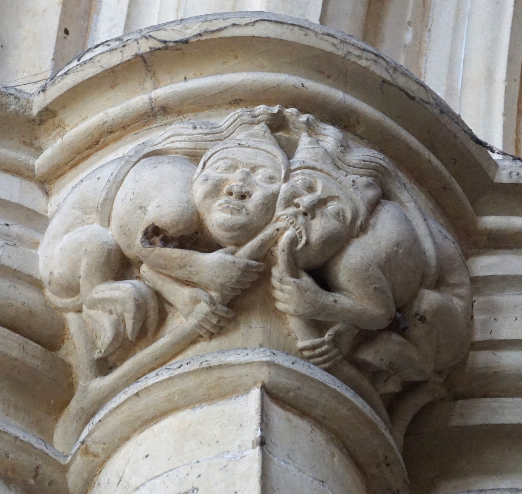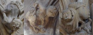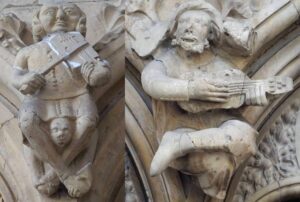 The “medical set” is an appealing idea, repeated in the modern Pitkin Guide published in 2000 (described below), but it is demonstrably erroneous. The first figure, supposedly representing stomach ache, has his hand on his chest, not his stomach, and he is an onocentaur, a mythical man-ass hybrid symbolising humanity’s dual nature as both rational/spiritual and lustful/sinful. (The onocentaurs of the Minster are described in the sixth article.) Mr. Forster’s interpretation of the middle two – lumbago and sciatica – can only be made through John Baker’s modern replacement arms and faces, since the original 14th century limbs were smashed. Not only is the imputed meaning of these figures interchangeable, the unfeasibly long replacement left arm of the ‘lumbago figure’ is all that indicates the ailment and the new Baker face of the ‘sciatica figure’ is the only indication of pain: take away these new elements and the meanings disappear. Both ‘dentistry’ figures are stripped to the waist, the one on our right has visible ribs, and both have arm hair hanging from their armpit to their elbows. Add to that the bulging eyes, grotesque features, and the fact that the uppermost man is not only pulling downwards on the other’s beard but also pulling up and back on his hair, and it becomes obvious that this is not dentistry but a fight for power between two devils (explained in the sixth article).