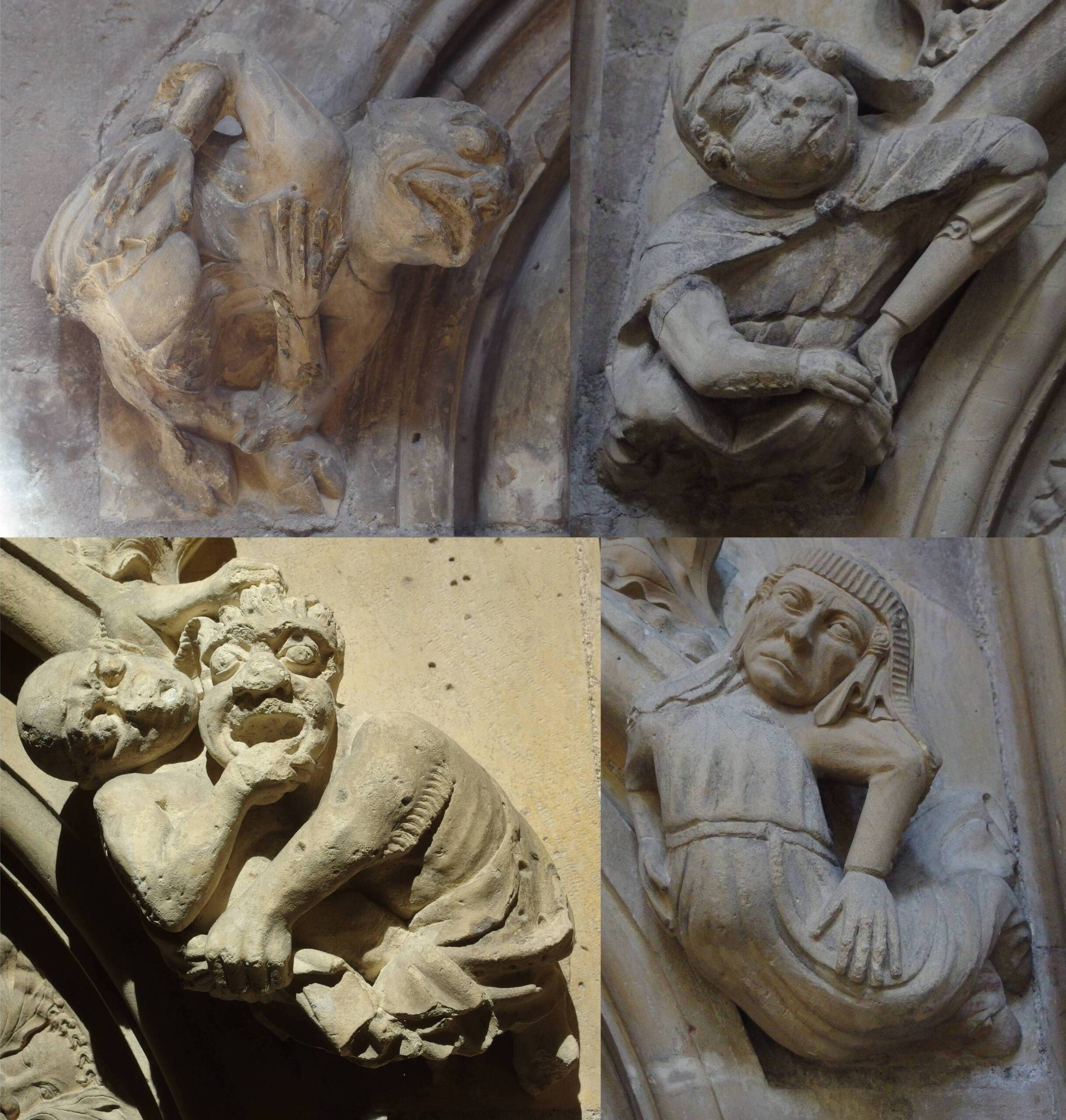 Beverley Minster A Brief History by J. Reay Forster (printed by A. Brown & Sons of Hull for The Friends of Beverley Minster) was first published in 1945. Its 44 pages are so well laid out and accessible for the visitor or other interested reader, with excellent black and white photographs, that it is no surprise it went through 4 editions and 17 prints until 1962. Though it includes photographs of 8 of the medieval musicians, there is no commentary or description. There are 4 photographs of non-musical stone carvings on the north wall, which he collects together as “the medical set”. Below we see images he identified as representing (clockwise from top left) stomach ache, lumbago (lower back pain), sciatica (spinal compression causing pain in the back, hip, and outside of the leg), and toothache.