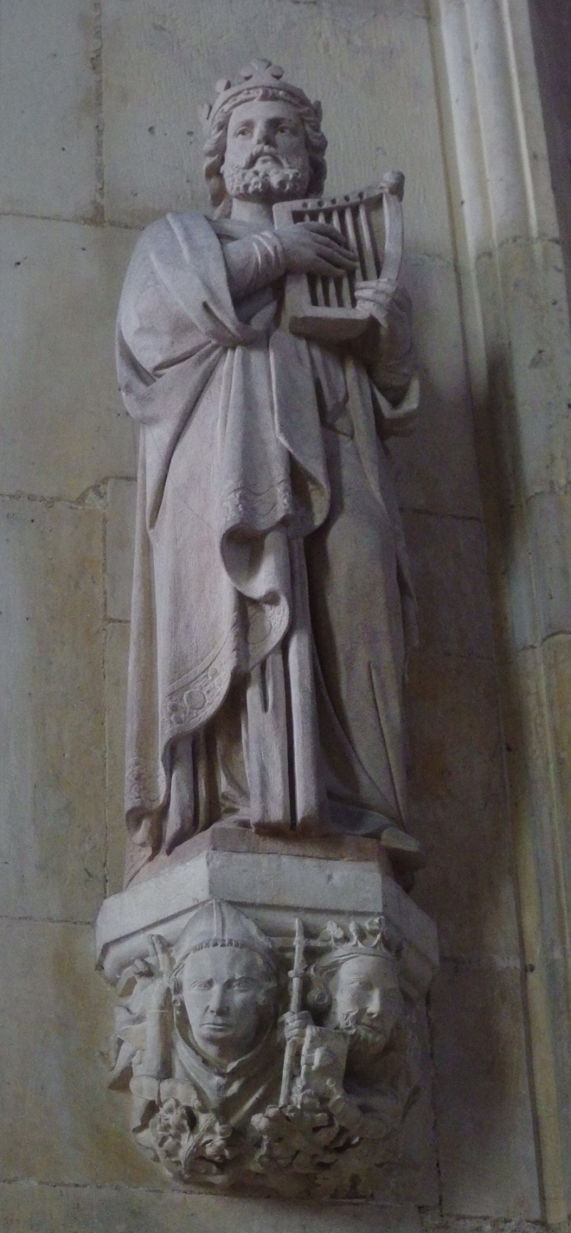 The Statues of Beverley Minster, their position and identity, with short notes by Edward Benjamin Bull, M.A., Vicar of Beverley Minster, 1958–1968, is a 56 page book written in 1967 (printed by A. Brown & Sons of Hull for The Friends of Beverley Minster). Edward Bull dedicates half his pages to the exterior statues. In the half on the interior statues, the author mentions only one medieval carving, non-musical. Only one reference is made to musical iconography: King David playing a harp, a creation of the late 19th or early 20th century, shown on the right.