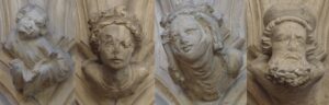 The title of Bruce Allsopp’s paper of 1959, A Note on the Arcading and Sculpture in the South Aisle of Beverley Minster in Architectural History (volume 2), is rather misleading in its vagueness. In the south aisle there are 6 or 7 minstrels, depending on whether we think the figure in bay M (below left) is a singer. However, the author’s attention is focussed largely on the possible royal identity of three of the heads in bay L (below), avoiding any mention of musicians in the south aisle.