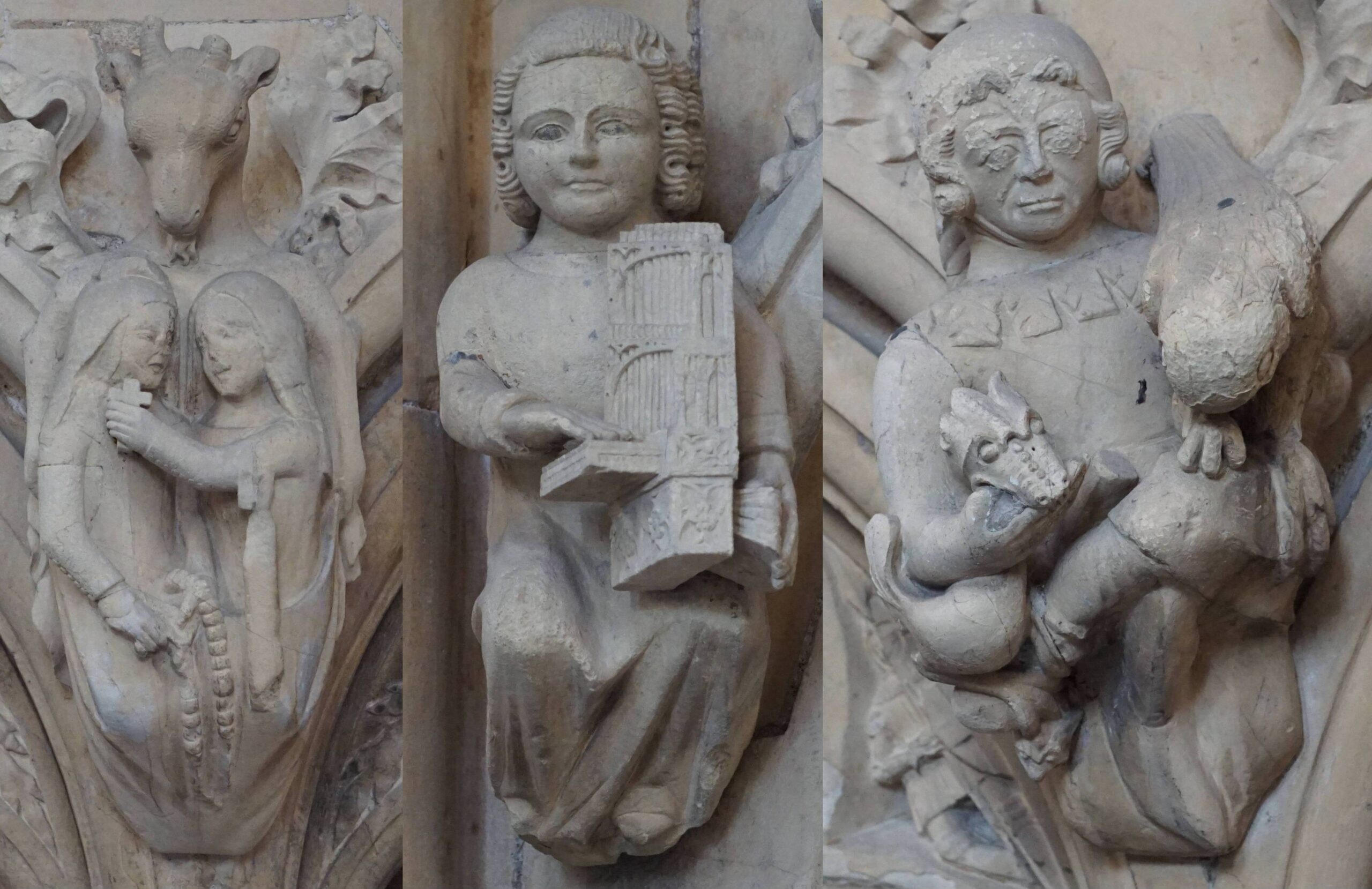 In bay C, she does not recognise Satan in the form of a goat, which she describes as a demon (below left). She identifies the portative organ as a book (centre), and describes the man with a symbolic dove and dragon for good and evil as “falconer with dog”, i.e. she thinks the dragon is a dog. (The symbolism of the Satanic goat and the man with the dove and dragon are explained in the sixth article.)