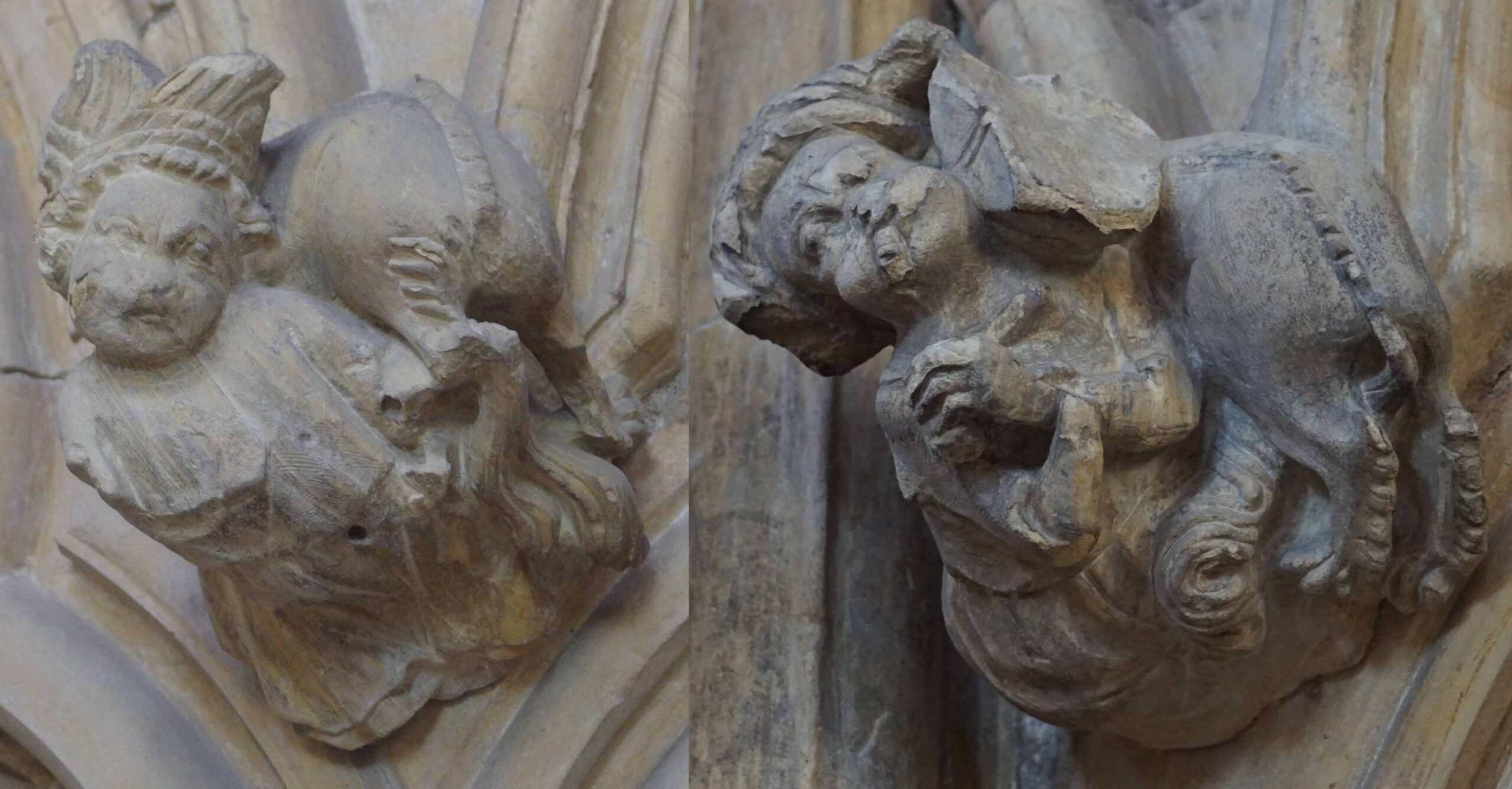 In bay M, the author fails to recognise the remains of a portative organ (below left) or the figure of Triton (below right).