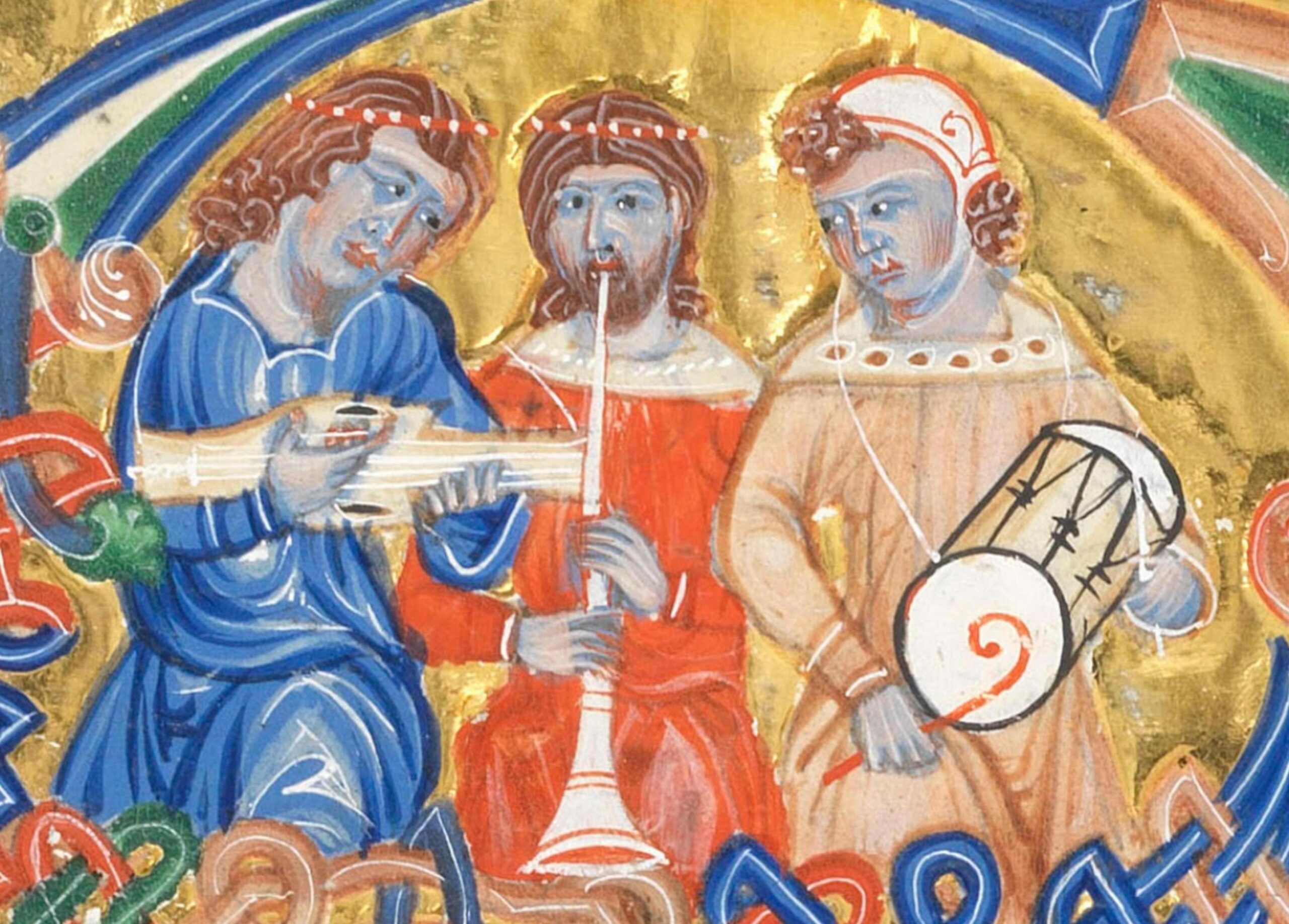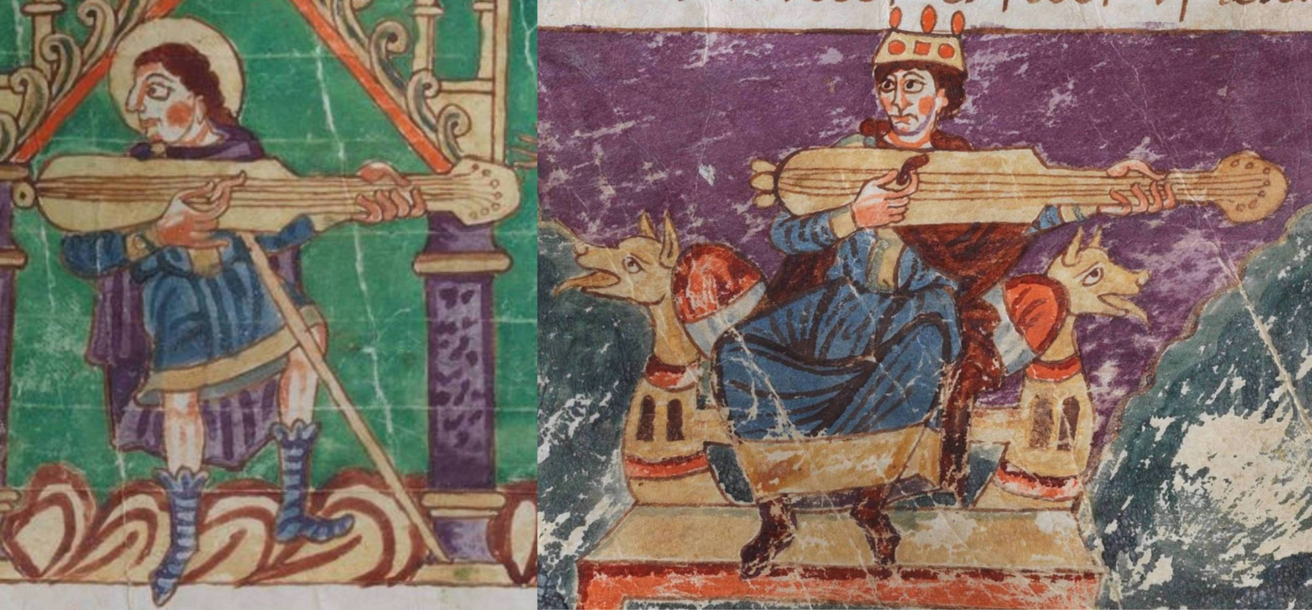 So while medieval and renaissance iconography gives us vital information about everyday musical practice, such as the plectrums in the Norfolk stained glass above, they are in this case and many others highly stylised. We know that the quill held by the gittern player is a quill, while also recognising that a real quill does not look exactly like this. In the same way, we can recognise that the cetra player in the Breslau Psalter, below left, is holding a plectrum, while also recognising that a plectrum cannot in reality be held like this. That we are seeing stylised artistic representations by an artist not proficient with the finer details also accounts for the trumpeter in the middle playing with a trumpet that is bent and apparently has no mouthpiece and, on the same page, …