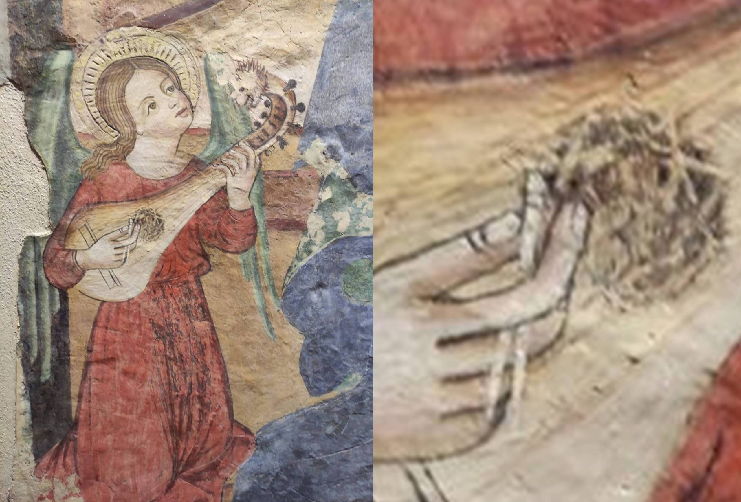 Left: Lutenist in Masaccio’s Virgin and Child, the central section of a polyptych altarpiece