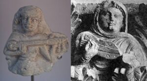 It isn’t only in medieval depictions that we see this impossible ‘arm under’ position: it was an ancient artistic convention for showing plucked chordophone players, as we see in the examples below from previous millennia.