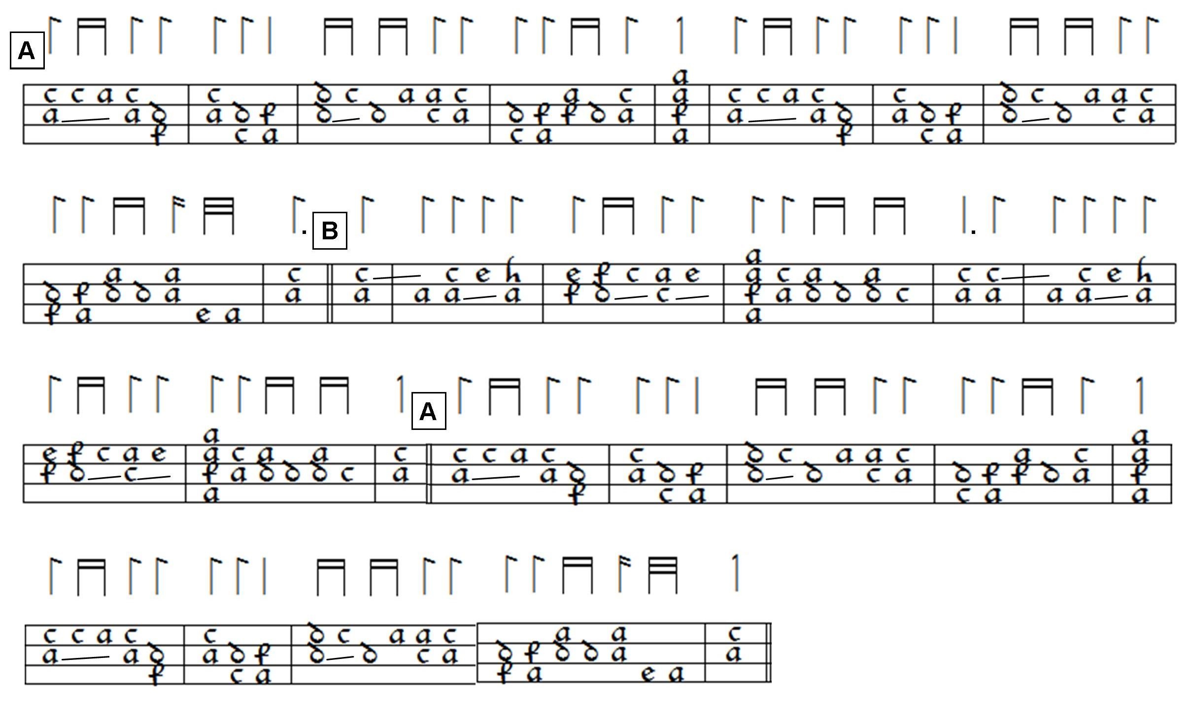 Further examples of two and three voice polyphony would underline the point that much similarly-pitched polyphony of the medieval period can be played without compromise on a fingerboard plectrum instrument, as long as the complexity of the moving voices does not preclude it.