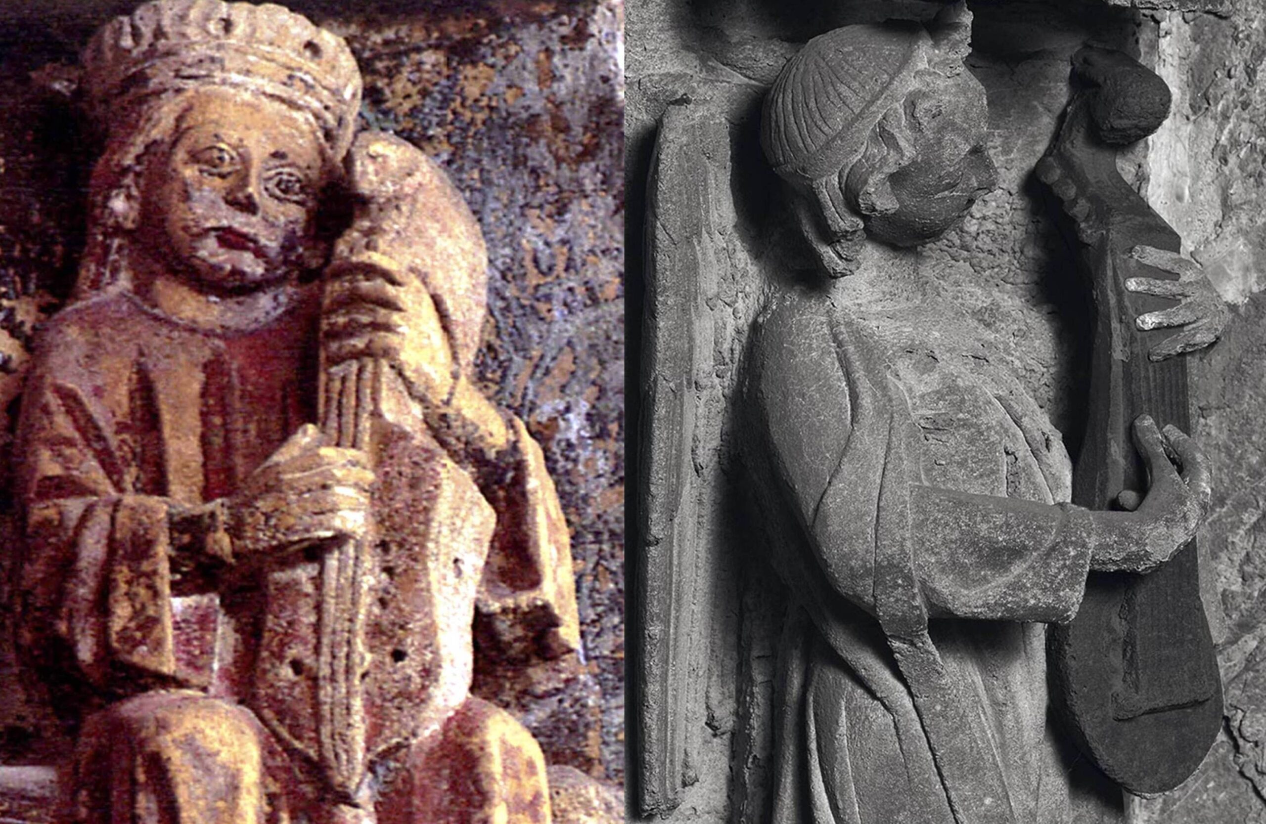 In every source that has a carved or drawn illustration of the Elders of the Apocalypse, both plucked and bowed representations of citharas are shown in a mixture of poses. A few are played, many are held upright in non-playing positions, and sometimes plectrum or bowed instruments are held in an upright pose as if they might be being played with fingers. Below left, for example, is an Elder in the Collegiate Church of Toro, Zamora, 1170–1250, with a citole held upright, plucked with fingers. Since this symbolises the cithara, the upright lyre, it cannot be taken as representative of musical practice any more than the similarly-held gittern in Pamplona Cathedral, Spain, 13th-14th century, below right.