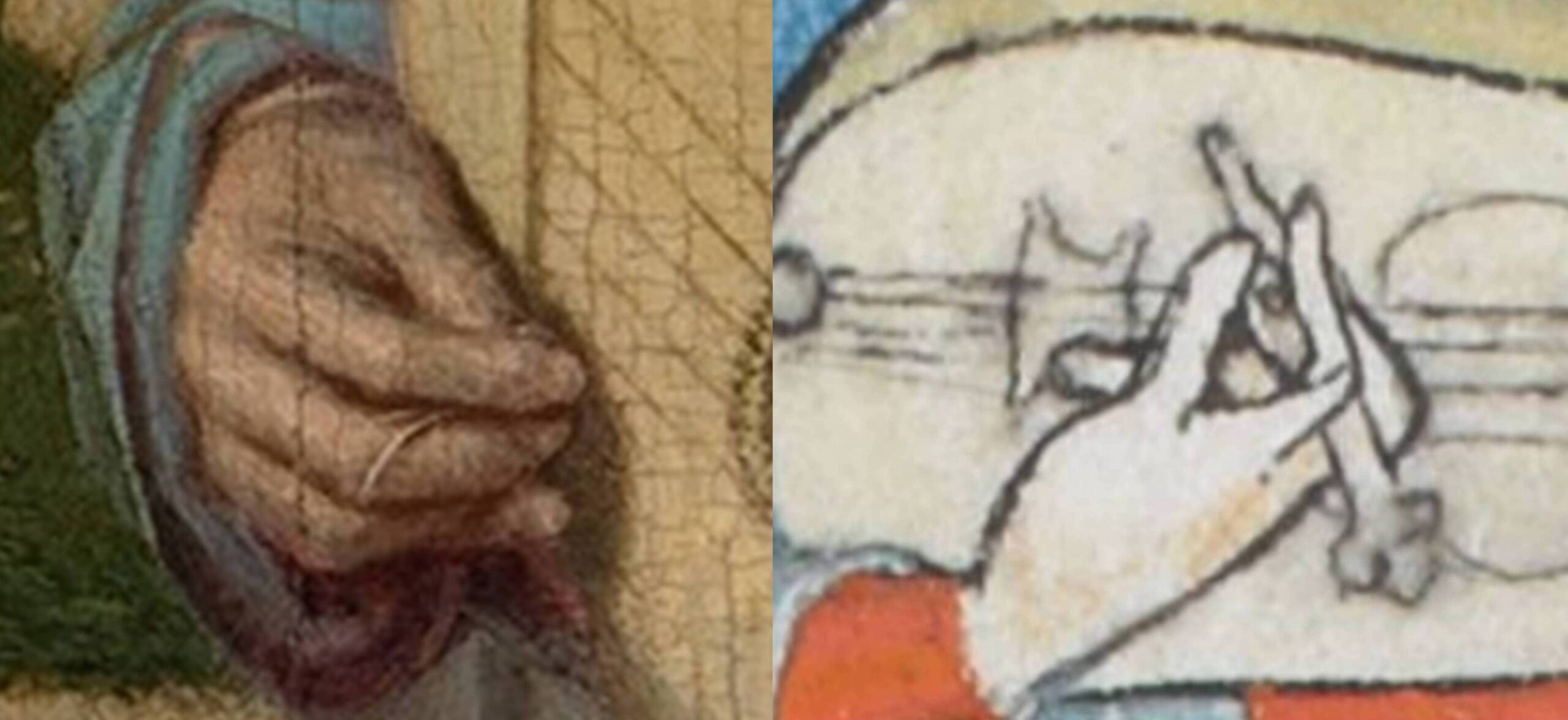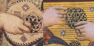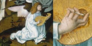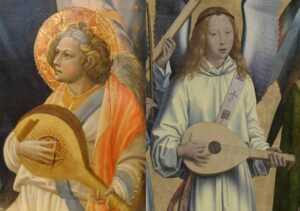 Marc Lewon (2017) has demonstrated the way in which 15th century lutenists adapted to the new musical style: they modified technique so that the plectrum was still held between the first and second fingers or between the forefinger and thumb, while other digits reached out to play non-adjacent courses with the flesh of the fingers. It is possible, as we have seen, for a plectrum player to dampen unneeded courses, but for complex polyphony it is more practical when playing more than two non-adjacent courses together, say courses 1, 3 and 5, to use a combination of plectrum and digits or, as later, to use independently moving fingers. We see this change of style, combining plectrum and digits, in Virgin and Child with angels by Giovanni di Marco (Giovanni dal Ponte), 1425 (Fitzwilliam Museum, Cambridge), below left; Hans Memling’s triptych for the Santa María La Real monastery in Nájera, Spain, 1480s (Koninklijk Museum Voor Schone Kunsten – Royal Museum of Fine Arts, Antwerp, Belgium), below right; …