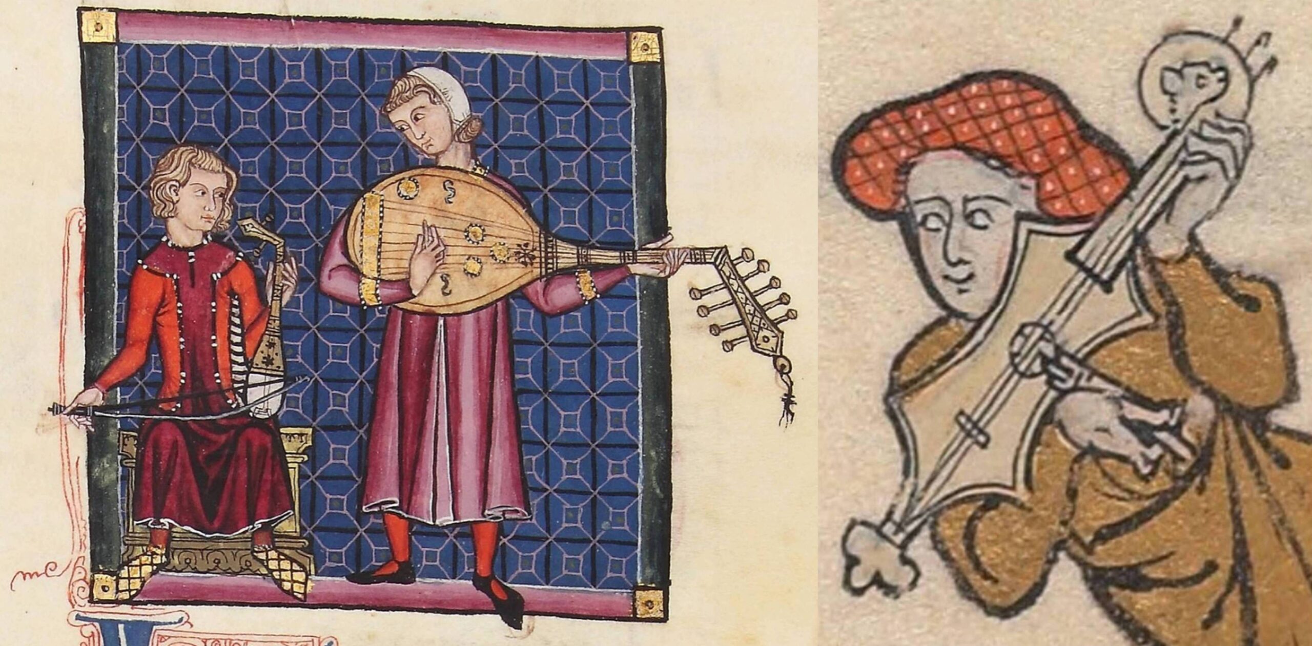 All the illustrations are variations of the same image, in the same or similar pose, with the same hand position holding a plectrum, except two. Folio 83r (second line, left) differs in essence only in that there is no plectrum, and folio 108r (third line, left) has the instrument in a near-vertical rather than a horizontal pose and apparently suspended in front of the seated player’s legs, a most unusual playing position (which we will see again and explain below). The lack of a plectrum on folio 83r cannot be counted as significant or as representing reality: only one of these instruments is shown with a bridge and none have sound-holes, but on practical grounds we cannot conclude from this that these instruments had neither bridges nor sound-holes.