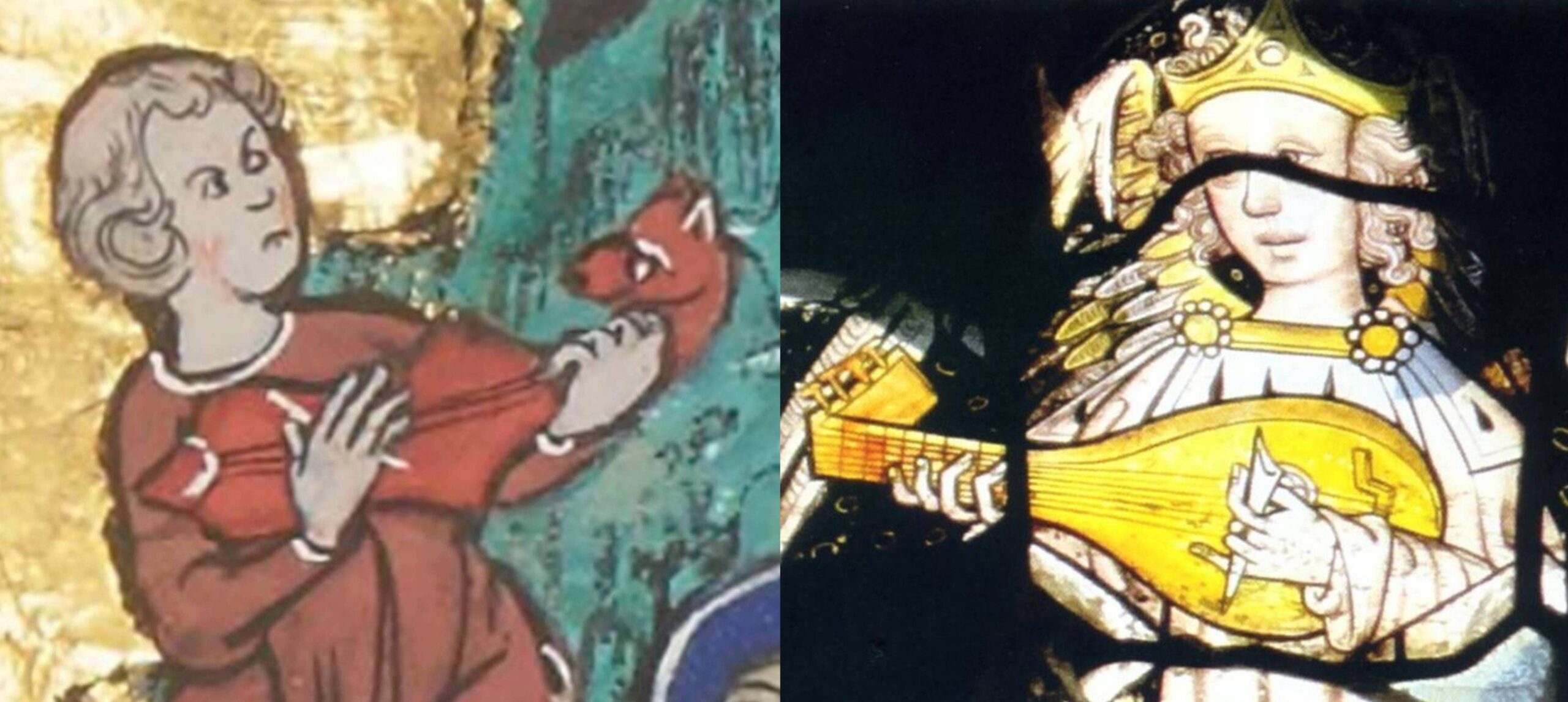 Additionally, there is the question of artistic convention. The playing hand of the harper and citoler above are virtually the same: this is one of the standard ways of showing a plucking hand in medieval and more simple renaissance iconography. We could choose from a huge number of comparative examples to demonstrate this ‘standard hand’. Two are below, a gittern and lute player in a stained glass window a century after the Saint Omer Psalter, both with plectrums, as we’d expect.