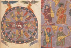 We see the same representation of Elders’ instruments in manuscripts. Beatus of Liébana was a Spanish monk who wrote a commentary on the last book of The Bible, The Apocalypse, also known as Revelation. For comparison, below we see three versions of the same Elders scene in three Spanish manuscripts of his commentary, all related textually and artistically: Morgan MS 644, c. 945; The Silos Apocalypse, British Library Add MS 11695, c. 975–1000; and Rylands Beatus, John Rylands Library, University of Manchester, Latin MS 8, c. 1190–c. 1210.